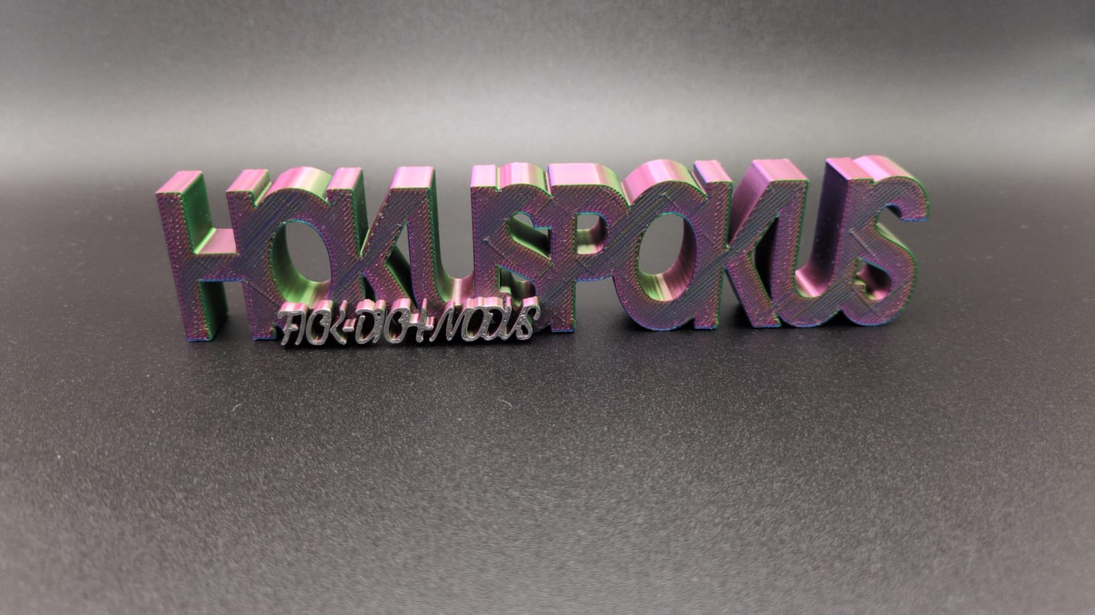 3D Druck Spruch in Metallicpink und Grün/Silber „HOKUSPOKUS FICK DICH MODUS“.