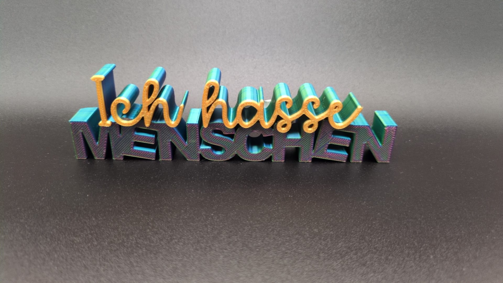 Der Druck ist in den Farben Türkis und Gelb. „ICH HASSE MENSCHEN „.