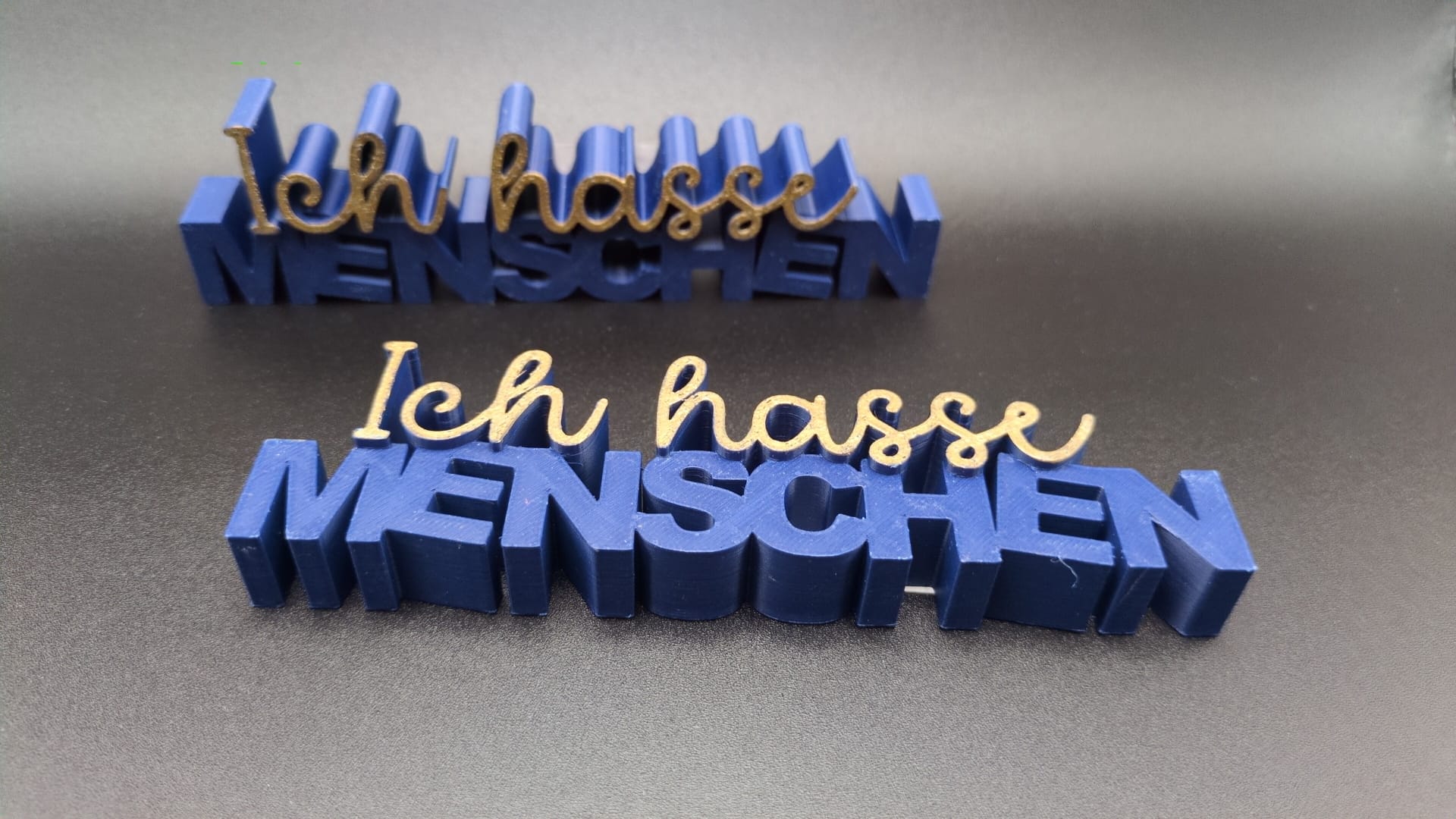 „ICH HASSE MENSCHEN „als 3D Druck zum hinstellen in den Farben Blau und Gold.