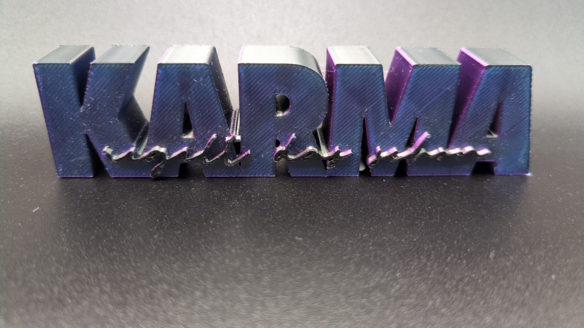 Der 3D Druck Spruch „KARMA REGELT DAS SCHON“ist auch in den Farben Lila-Blau und Silber erhältlich.