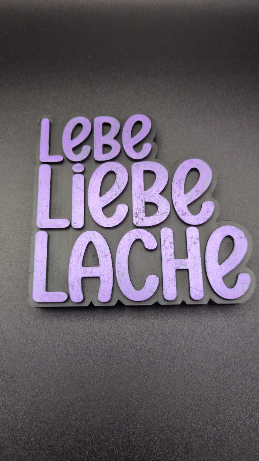 Der 3D Druck Spruch „LEBE,LIEBE, LACHE“ist in den Farben Lila und Schwarz gearbeitet.