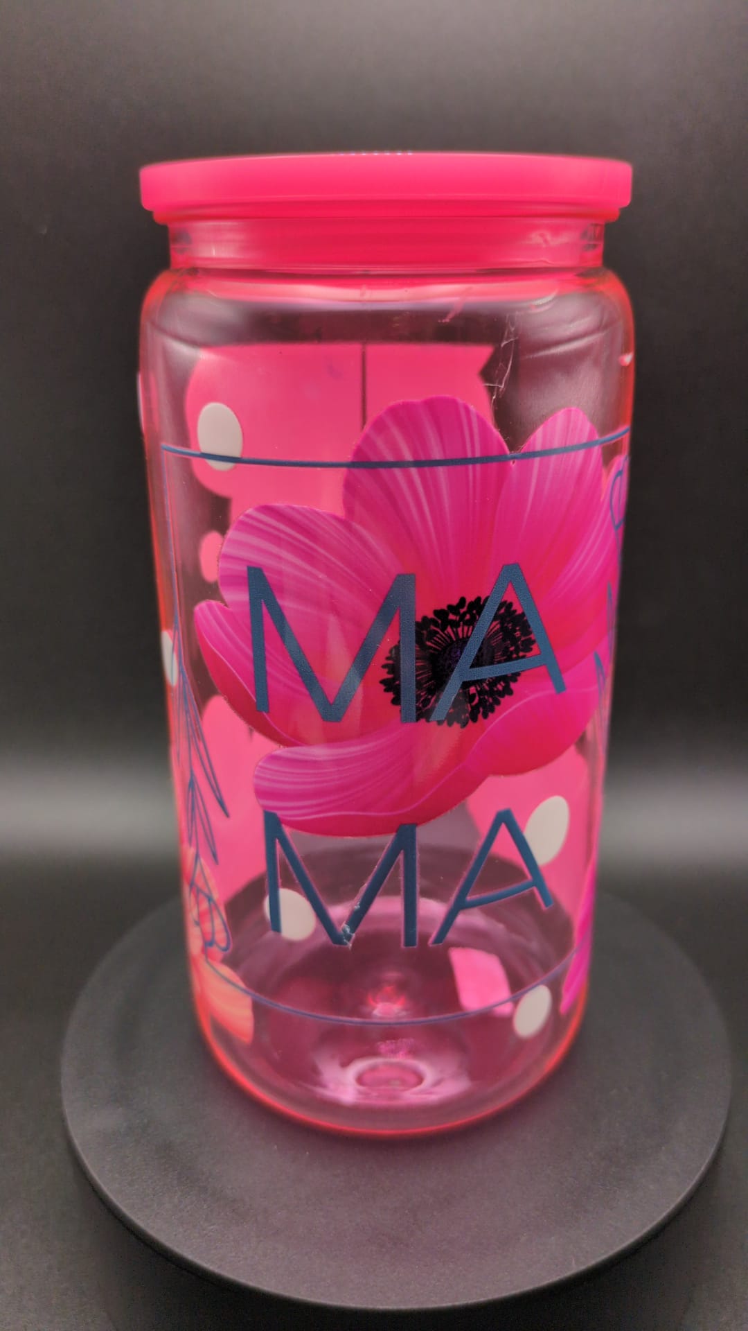 Der Tumbler ist pink und durchsichtig mit der Aufschrift „MAMA“.