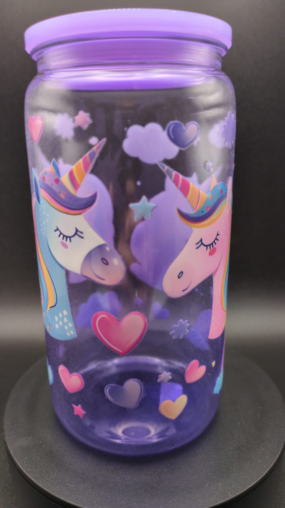 Kunststofftumbler in Lila mit Einhörnern als Motiv.