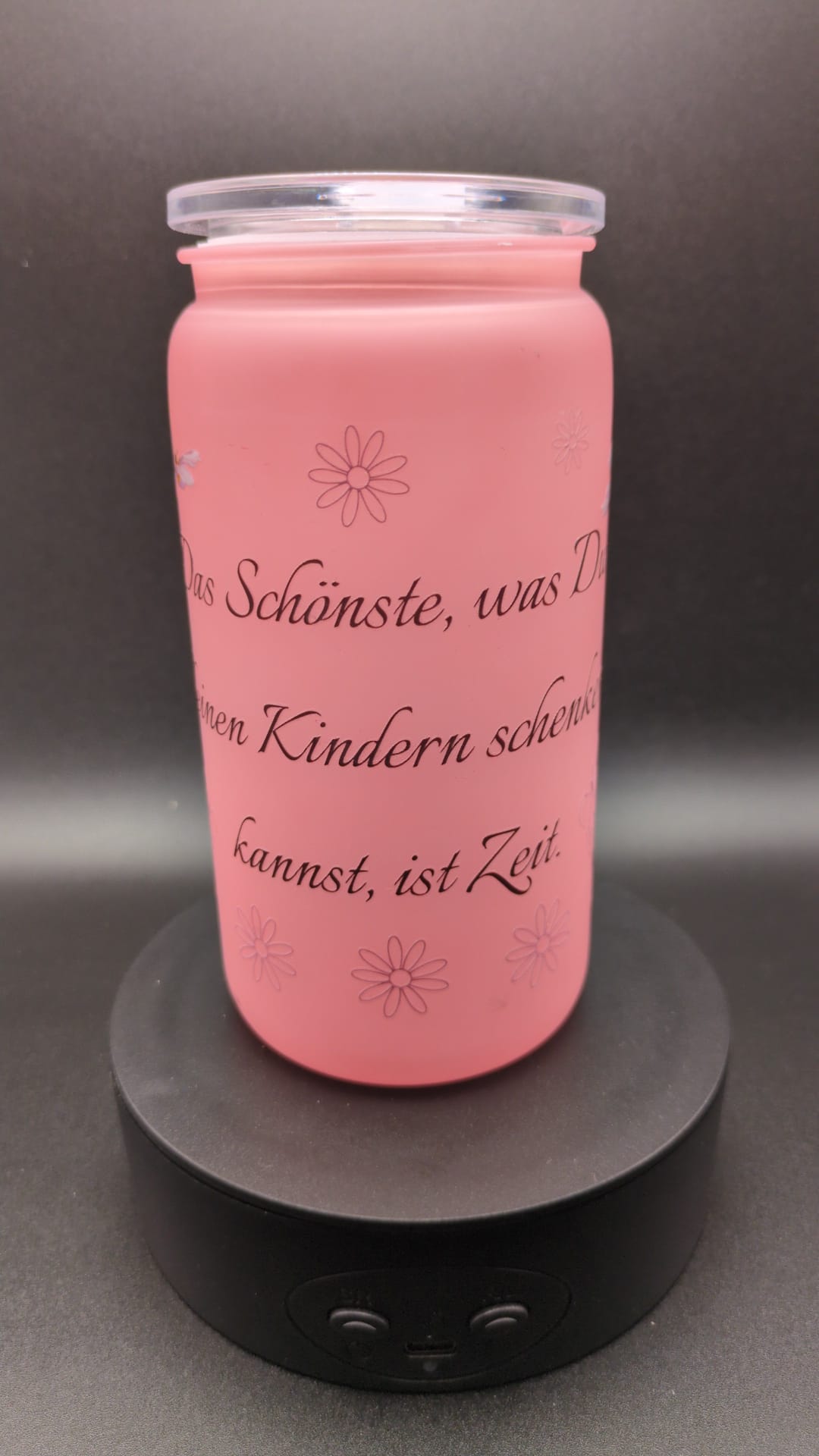 Kunststofftumbler in Rosa mit Spruch „Das schönste was du deinen Kindern schenken kannst ist Zeit“.