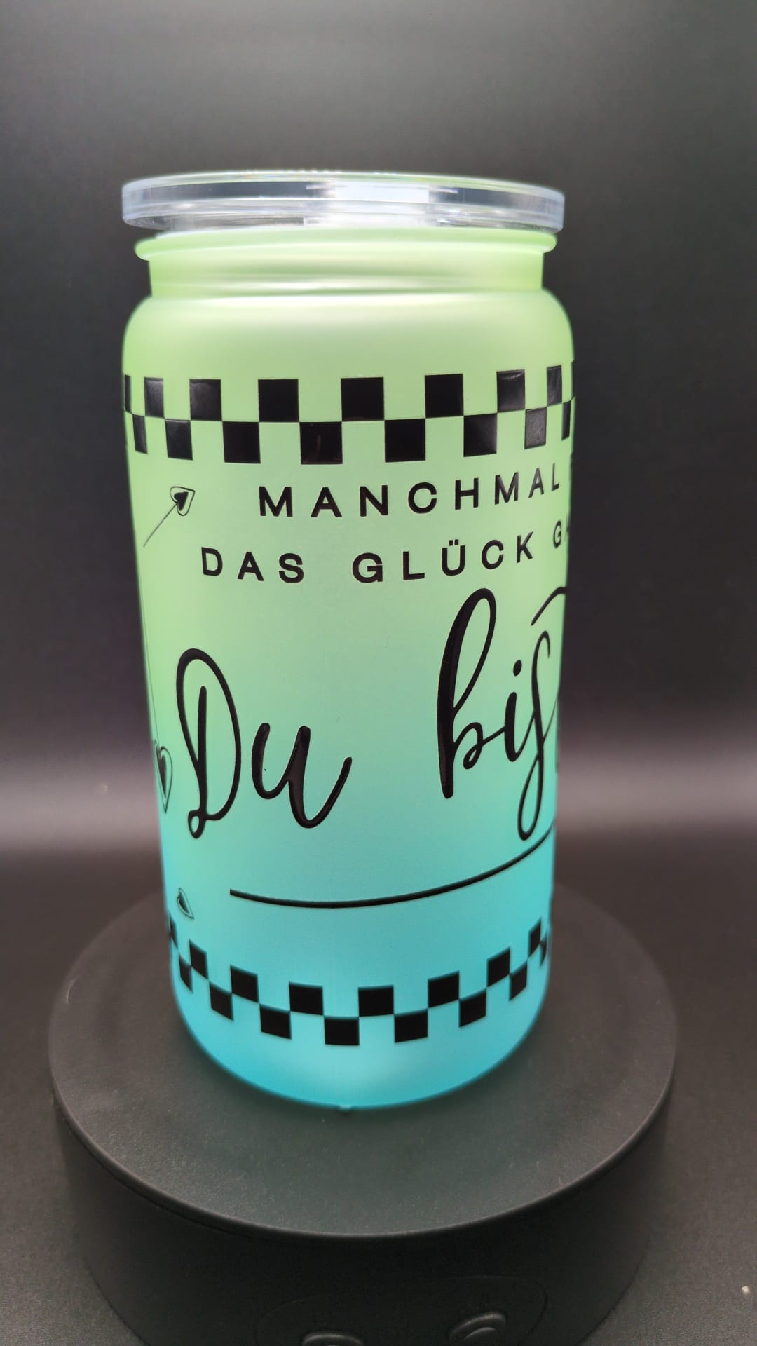 Kunststofftumbler Hellgrün/Hellblau verlaufend mit Spruch. „DU BIST DRAN“.