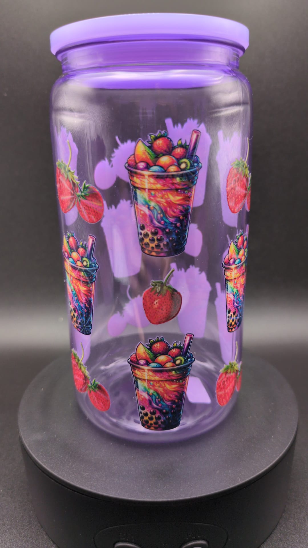 Kunststofftumbler durchsichtig in lila mit Früchtebecher als Motiv.