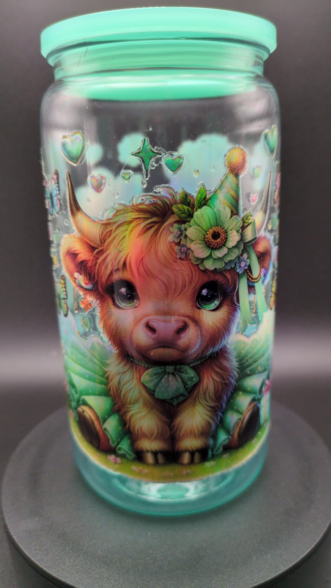 Durchsichtig Grün ist der kunststofftumbler mit einer Kuh als Motiv.