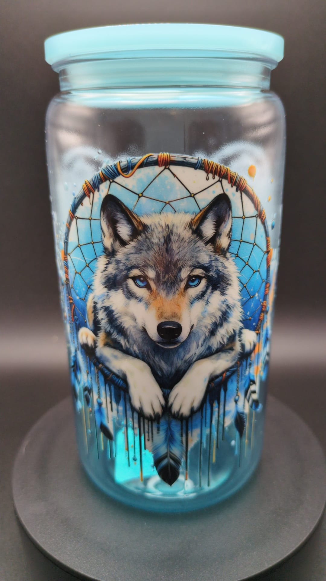 Durchsichtig Hellblau ist der Tumbler mit einem Traumfänger und Wolf als Motiv.