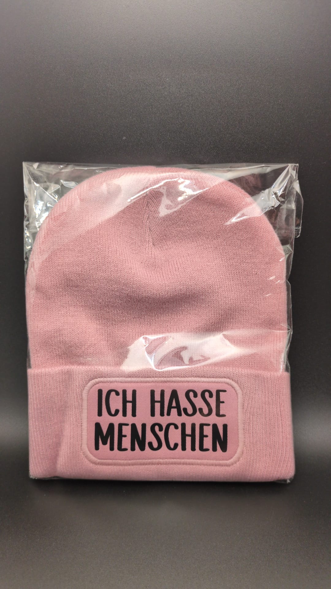 Eine rosa Mütze mit einem Spruch „ICH HASSE MENSCHEN „.
