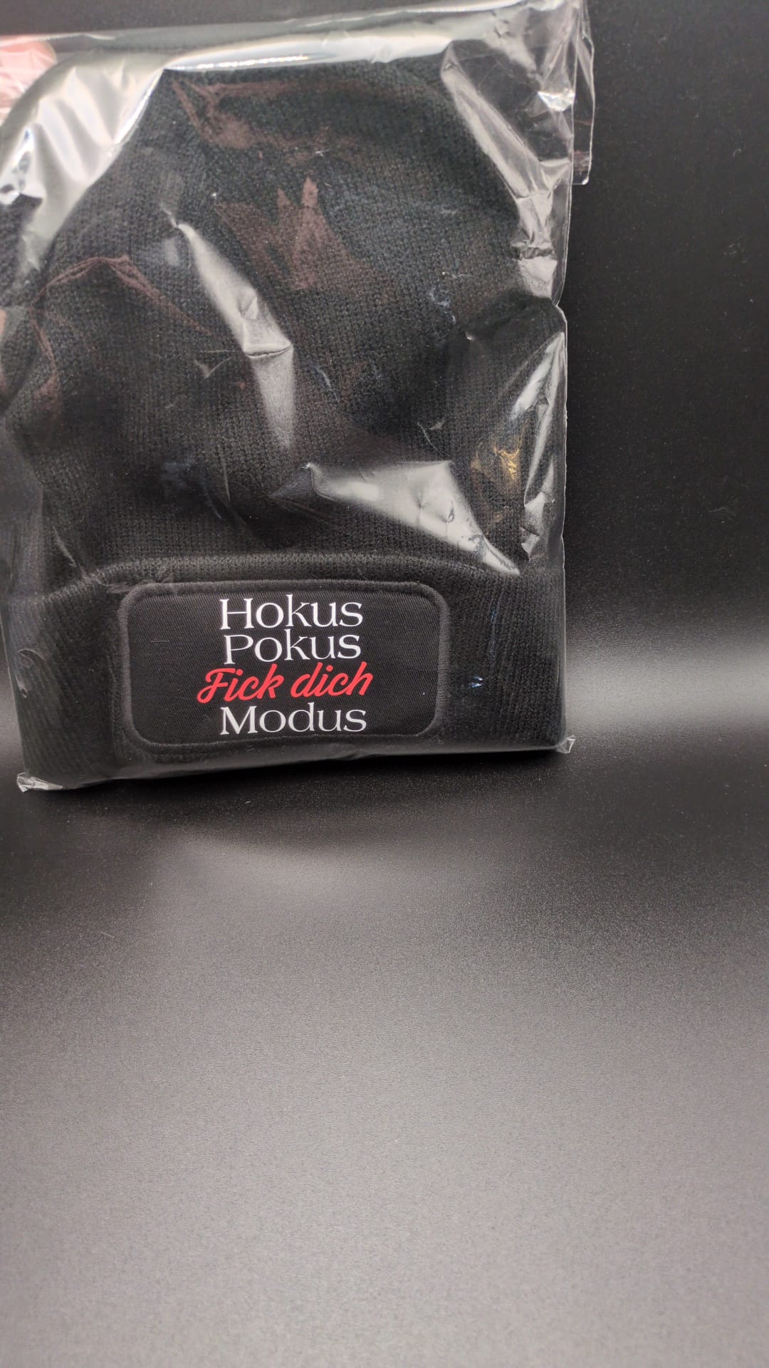 Diese Mütze ist schwarz und trägt folgenden Spruch „HOKUSPOKUS FICK DICH MODUS „.