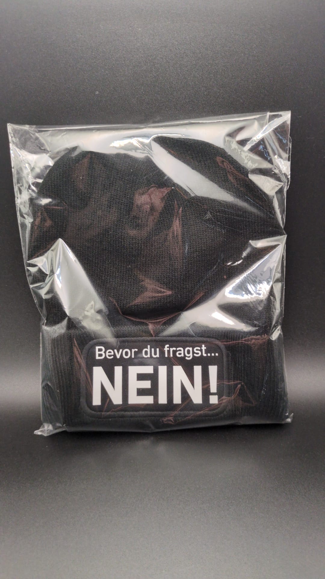 Diese Mütze ist schwarz mit dem Spruch “ BEVOR DU FRAGST NEIN “ .