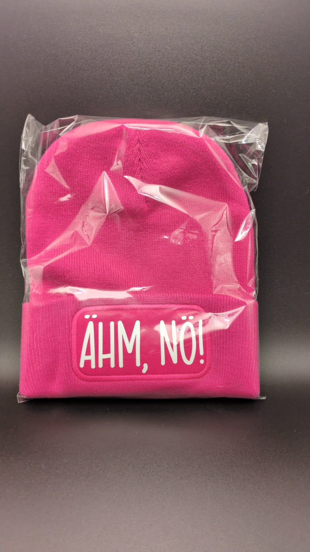 Die Mütze ist pink mit dem Spruch „ÄHM,NÖ!“