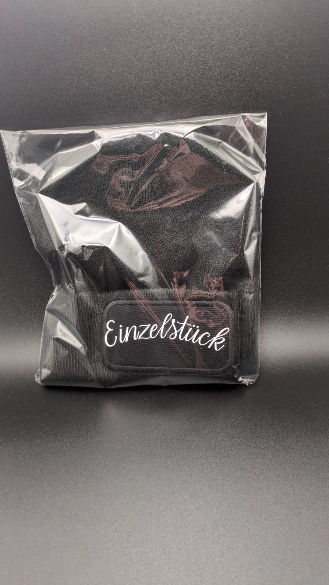 Die Mütze ist schwarz mit dem Aufdruck „EINZELSTÜCK „.