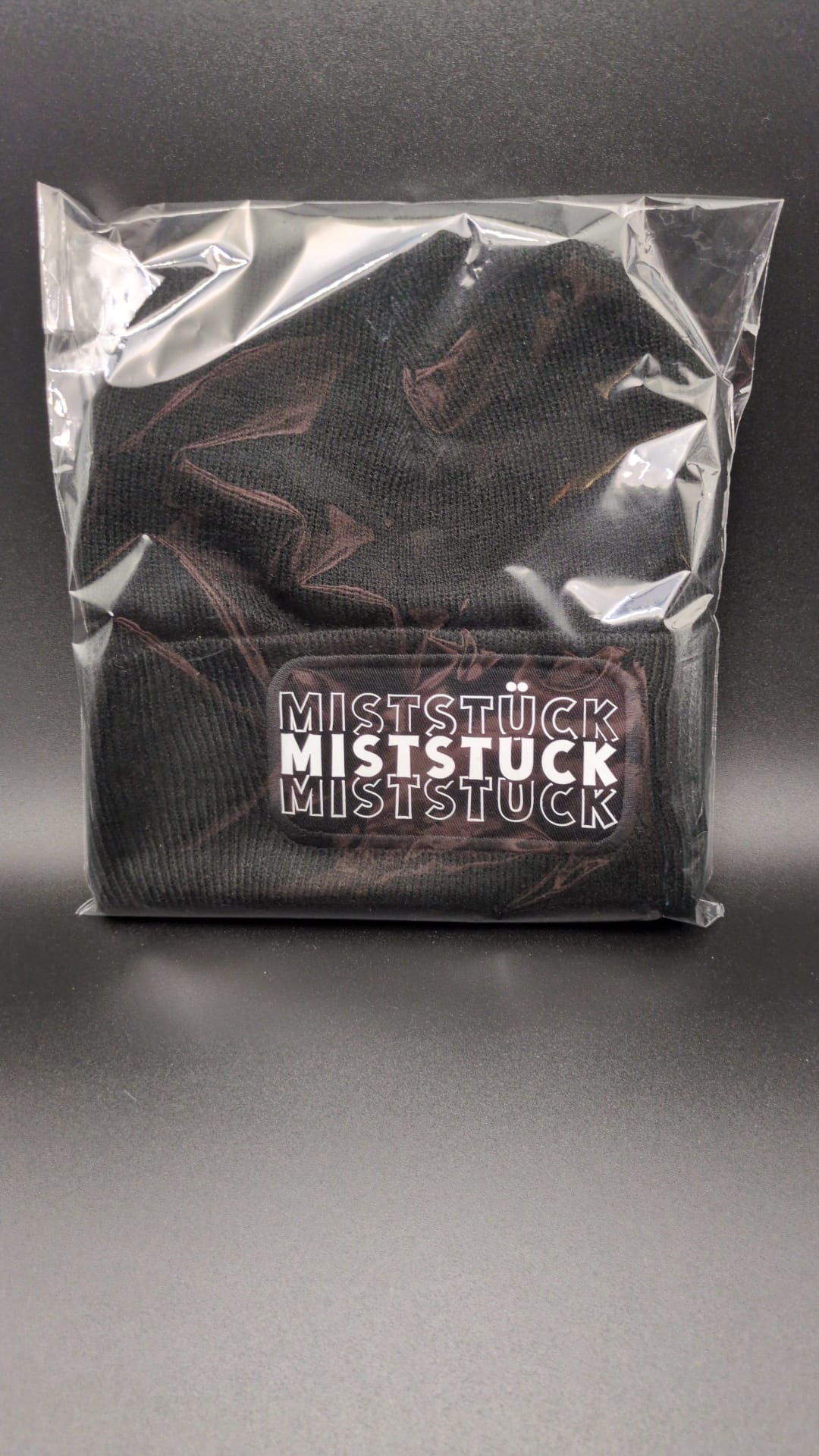 Die Mütze in schwarz mit einem Spruch. MISTSTÜCK“.