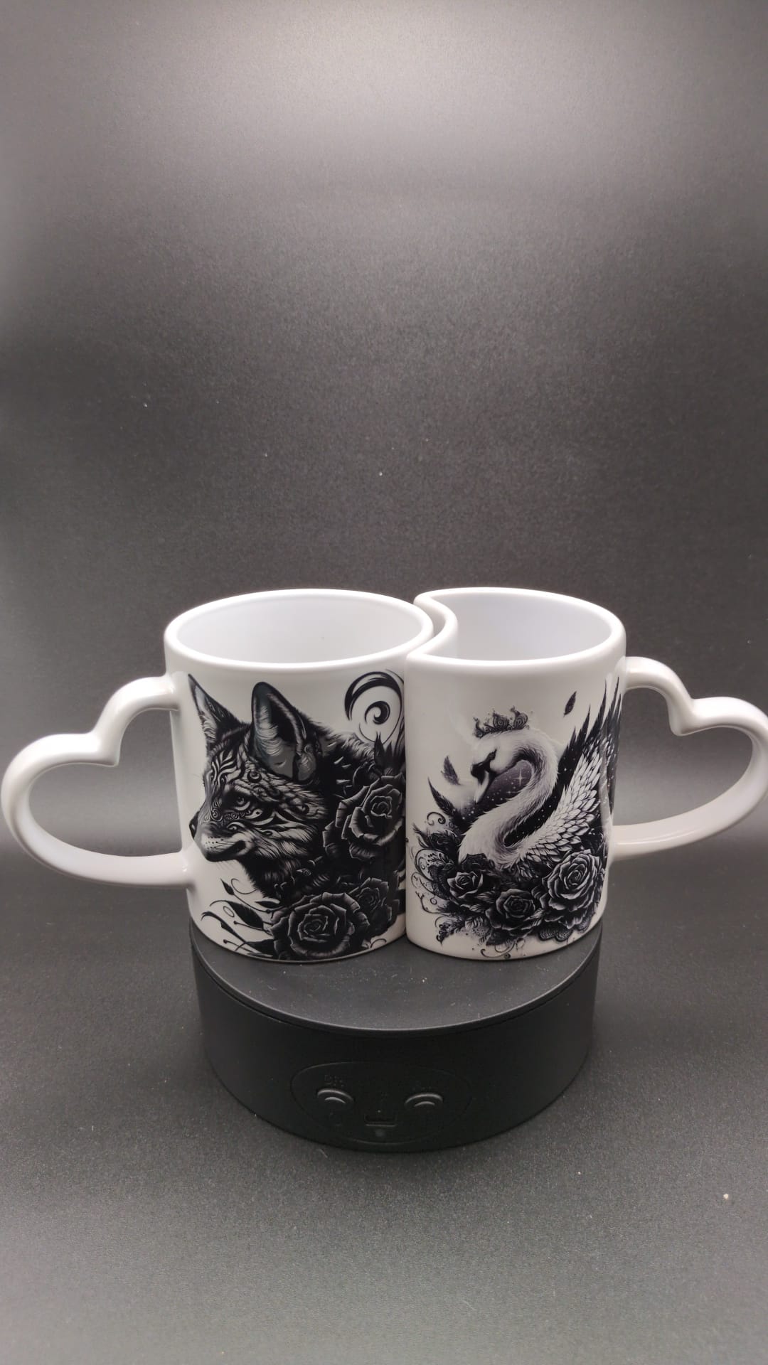 Eine wunderschöne Partnertasse in Herzform. Ein Teil mit katzenmotiv und das andere Teil mit einem Schwan .