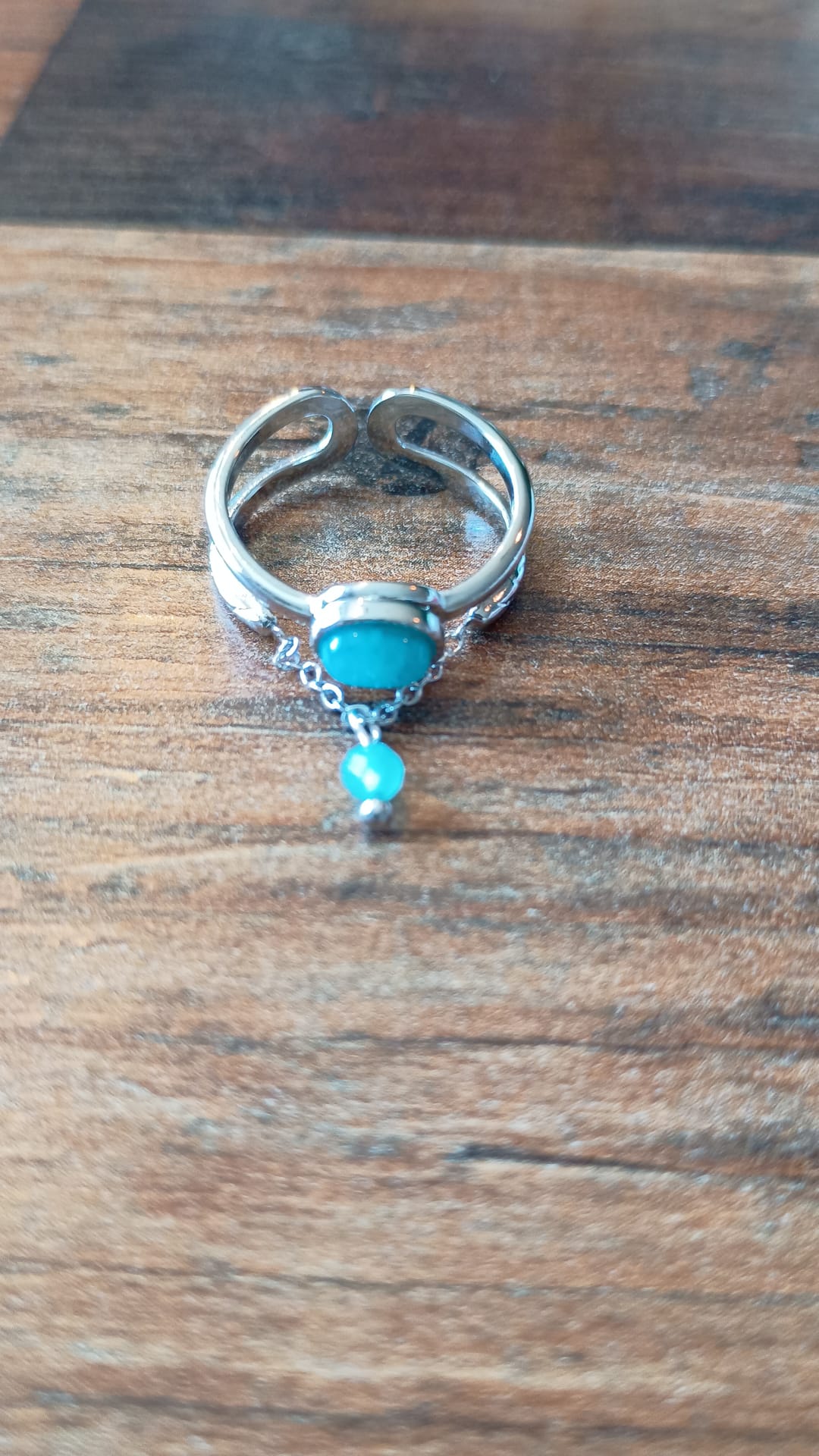 Der Ring ist aus 18mm Rostfreien Edelstahl in Silber gearbeitet. Es befinden sich 2 türkisfarbene Perlen daran . Die kleine Perle hängt an einem Kettchen.
