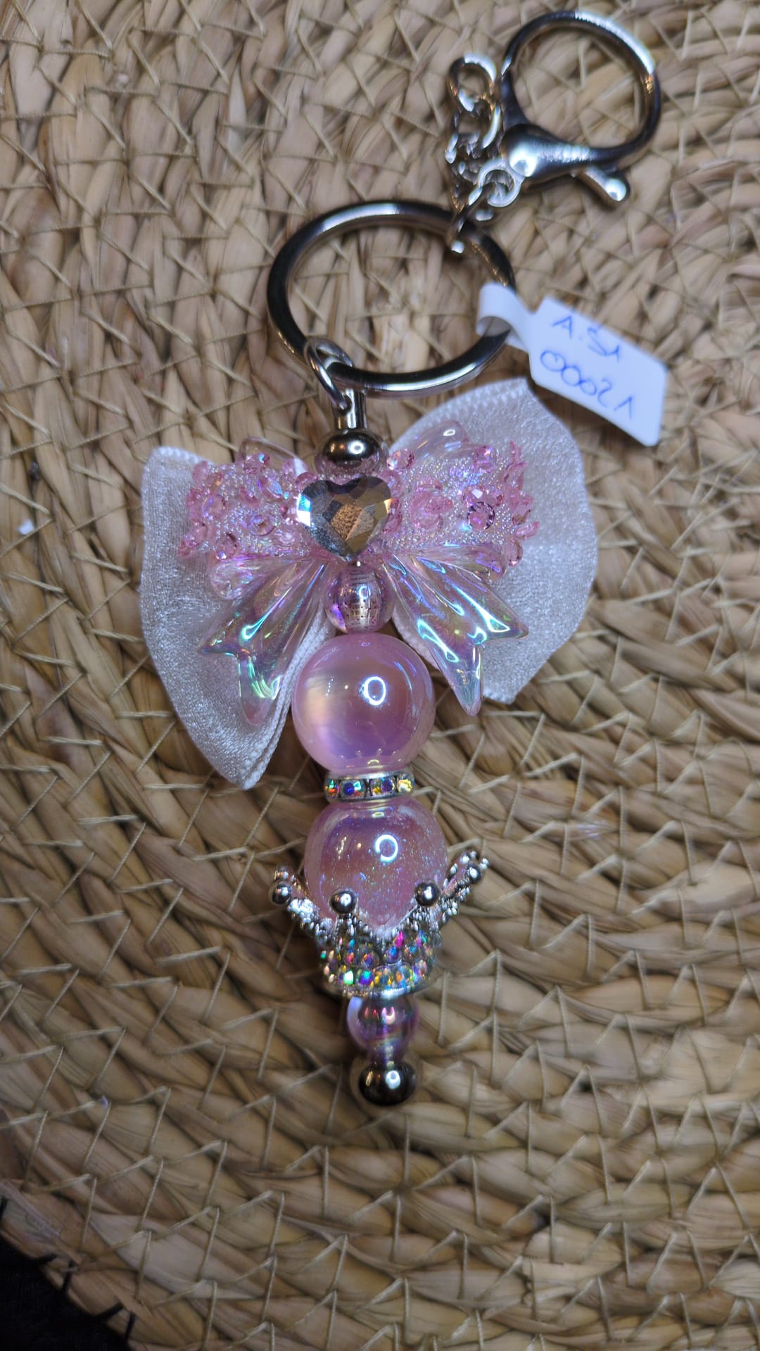Ein traumhafter Schlüsselanhänger mit Karabiner. Verziert mit drei rosa Perlen,einer silbernen Krone und einer pompösen Rosa Schleife