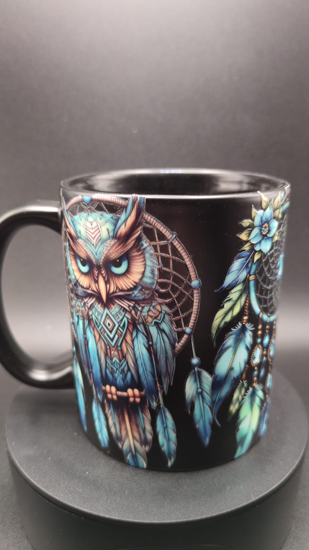 Die Tasse ist schwarz mit eine Traumfänger und einer Eule .
