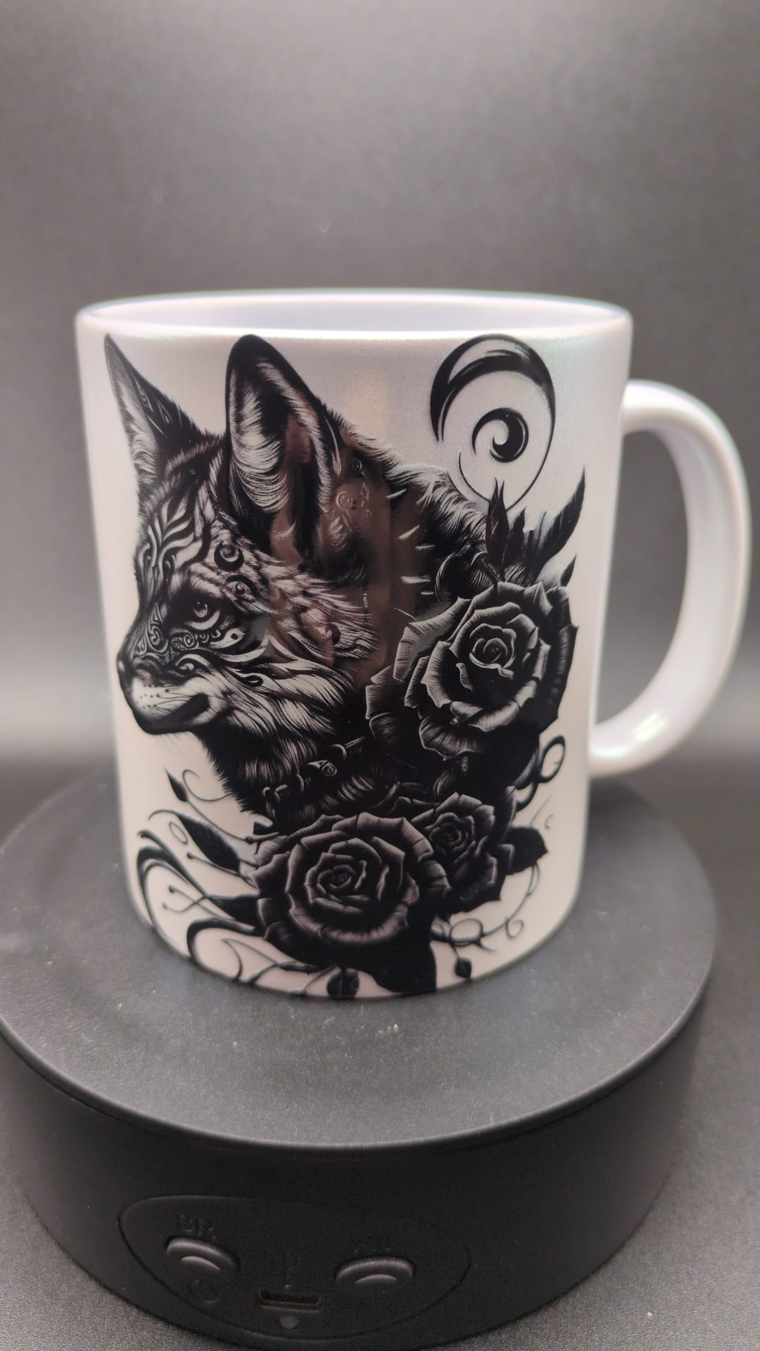 Eine schöne Tasse mit einer Katze verziert mit einer Rose als Motiv .